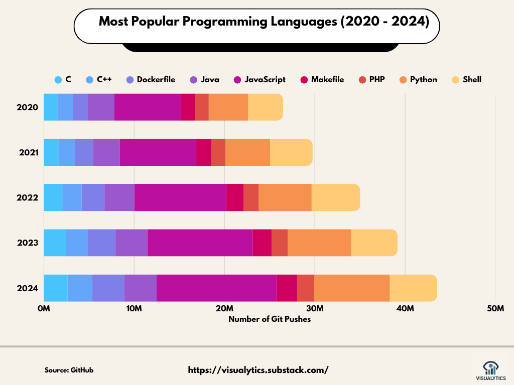 Every year, millions of developers push code to GitHub, and with each commit, developers around the world leave behind clues about which stories or problems they are trying to tell or fix. Using data from GitHub I compared push activity from 2020-2024 to see how the programming language landscape is shifting.